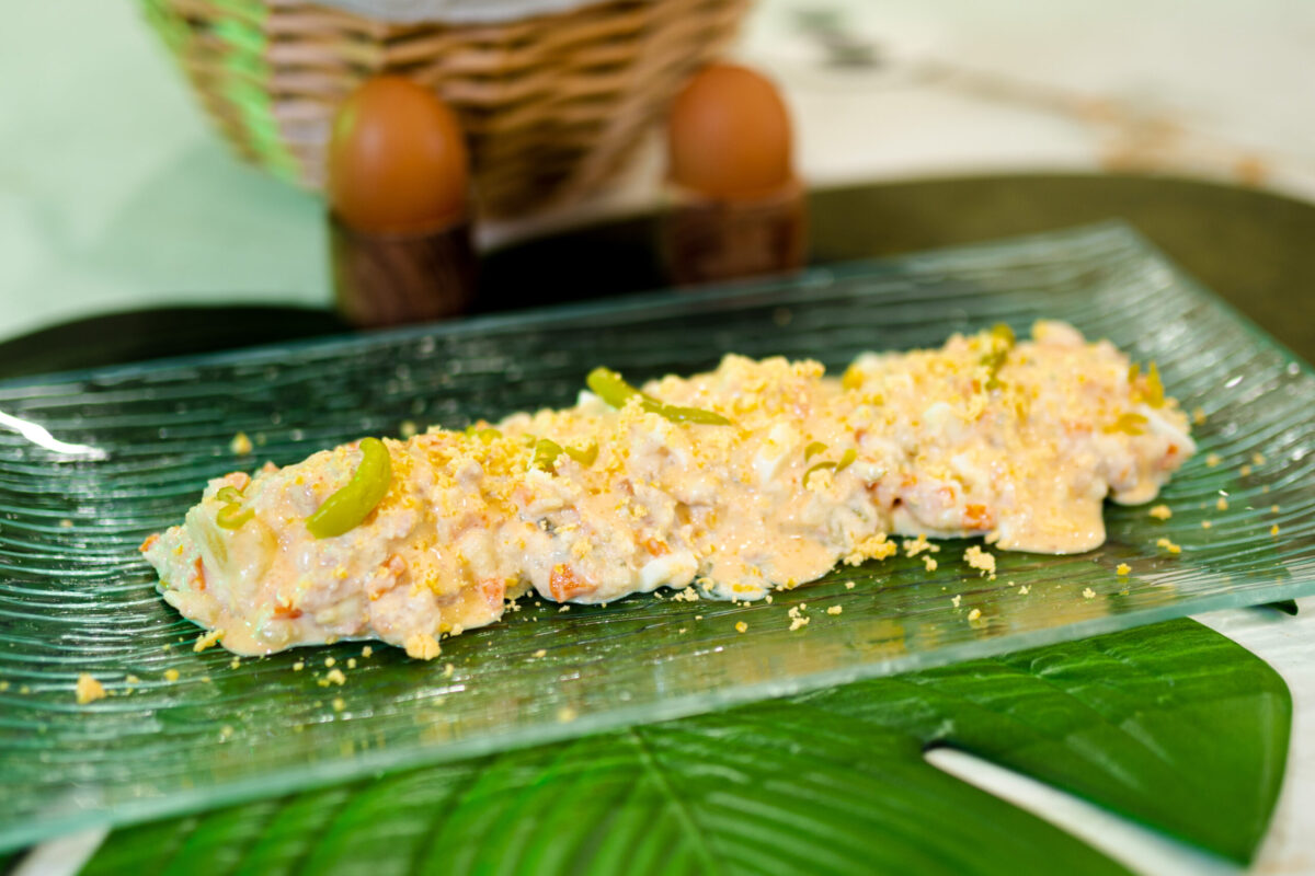Es hora de emplatar. Ponemos la patata y la zanahoria en una fuente y añadimos los encurtidos, el atún de lata, las gambas y los dos huevos El Granjero Libres de Jaula cocidos. Mezclamos bien e incorporamos la mahonesa. Emplatamos y colocamos por encima la otra parte de la mahonesa con la salsa sriracha que habíamos apartado y ya tenemos nuestro clásico preparado.